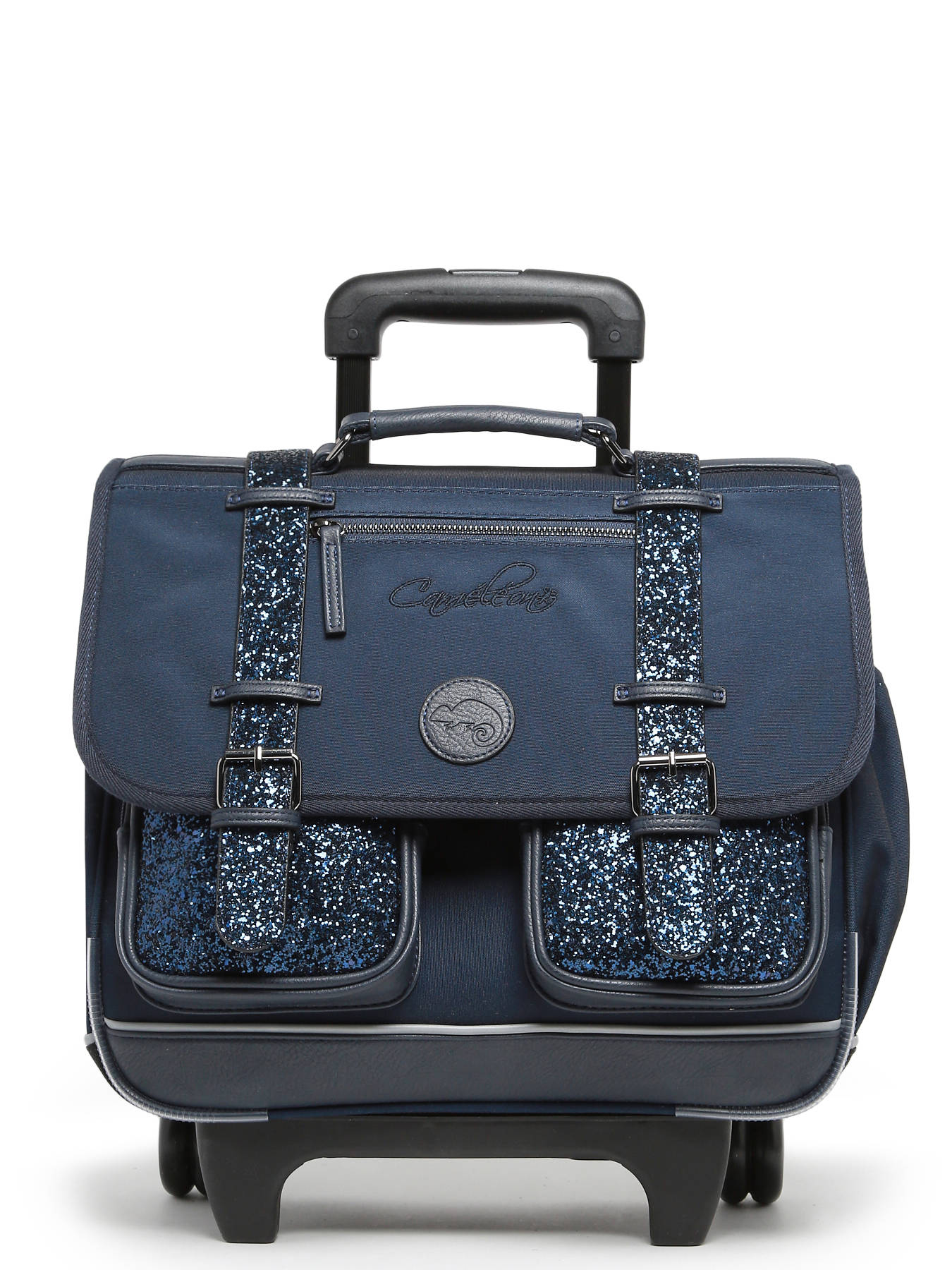 38 cm - 21 litres - 2.38 kg ~ Cartable à roulettes 38 cm de la ligne Vintage Fantasy signé Caméléon. Idéal pour le CP, CE1 et CE2. Composé de 2 compartiments séparés par une poche centrale zippée, ce cartable enfant est pensé pour ranger toutes les affaires scolaires. Les trois poches extérieures zippées sont idéales pour ranger les petits effets comme l'agenda ou le goûter. Fonctionnel, le cartable a un emplacement pour la gourde à l'extérieur. Pour faire rouler le cartable, les bretelles doivent être rangées dans la poche au dos. A la fois renforcé et rembourré, ce modèle assure confort et résistance. Côté sécurité, ce cartable dispose de bandes réfléchissantes sur le devant et sur les bretelles du cartable. Le cartable à roulettes Caméléon est fabriqué en polyester recyclé imperméable. Petit plus, la règle est offerte !